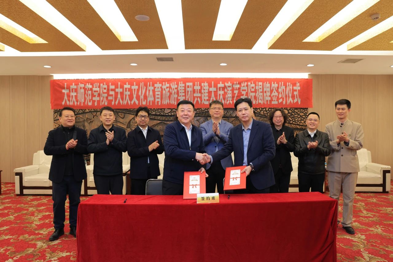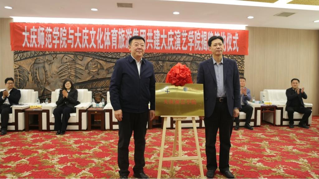 许双毅与郭泽斌代表双方签署合作协议。随后,双方共同为大庆演艺公司揭牌,标志着双方在演艺人才培养、文化产业发展等领域开启深度合作。